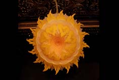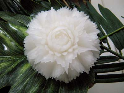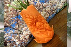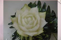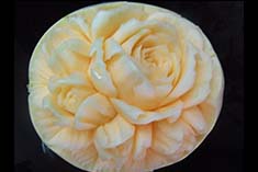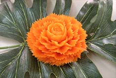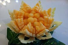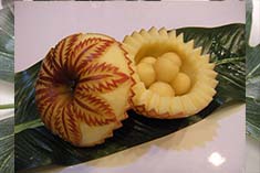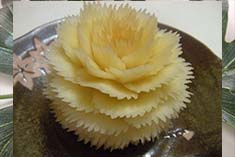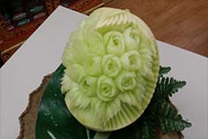 フルーツカービングのお話 スコータイ王朝時代 ナーンノッパマット妃が王様を喜ばせるため にフルーツや野菜に美しい花鳥風月を彫刻したのが始まりで食材で 食卓を華やかに演出したり石鹸に彫刻をして贈答品としても使われ ます。フルーツや野菜にタイの伝統の花鳥風月を掘り込む技術で宮廷 料理を華やかに演出するために発達しました。タイでは学校の授業に 組み込まれるほど生活に浸透した伝統文化です。応用で石鹸に彫刻を して贈答品としても使われます。 |