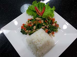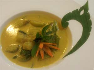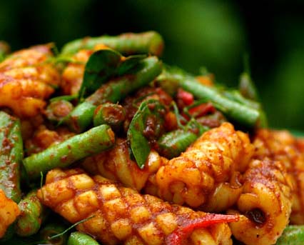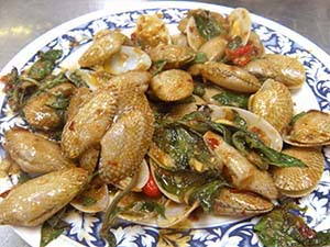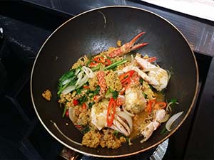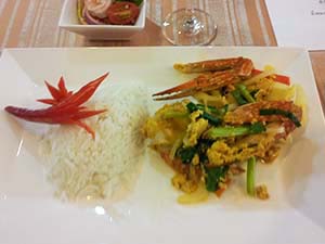 | プーパッポンカリー カニ身と長ネギ、玉ねぎの炒め物でカリーと名の通りカレー風味で日本人に最も人気のあるタイ料理の一つです。 |